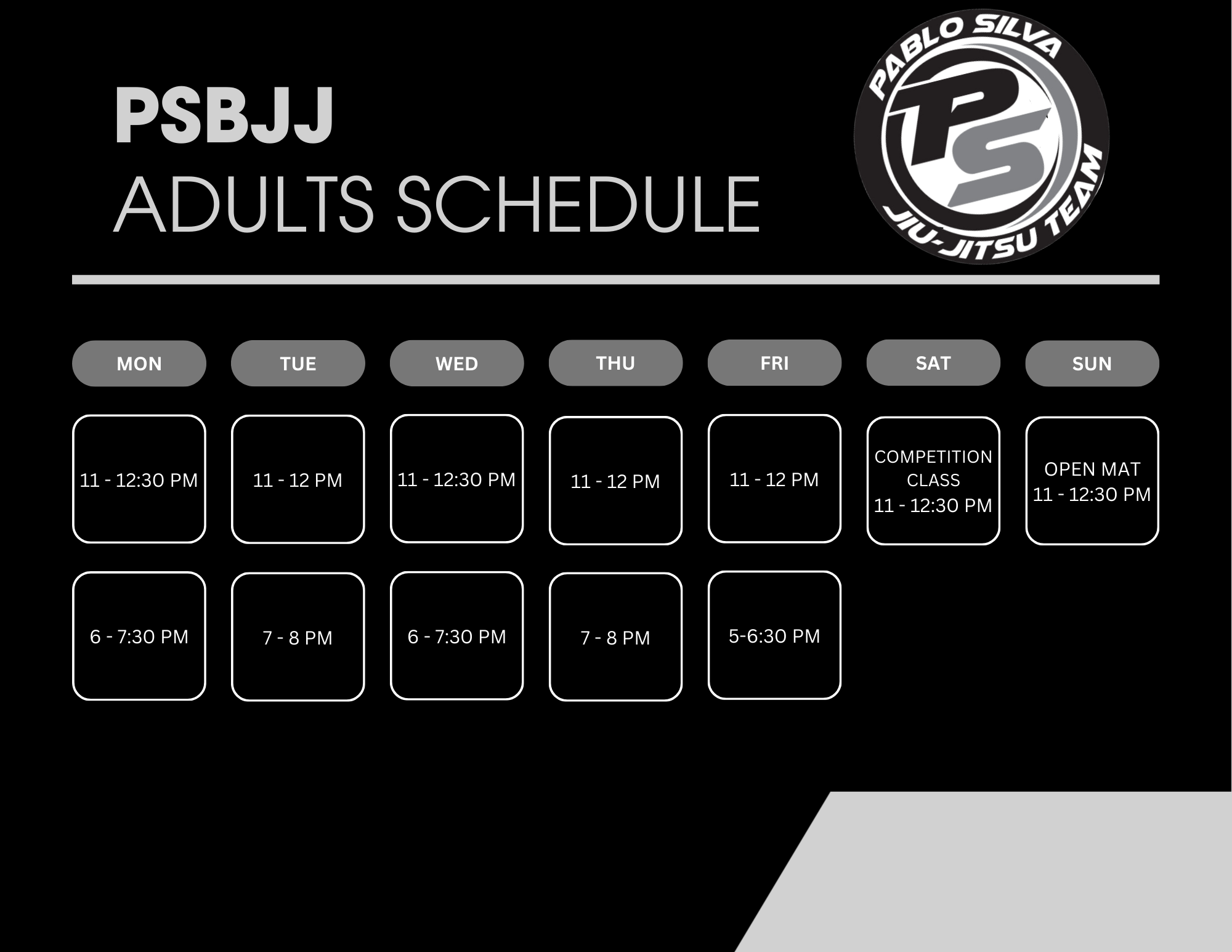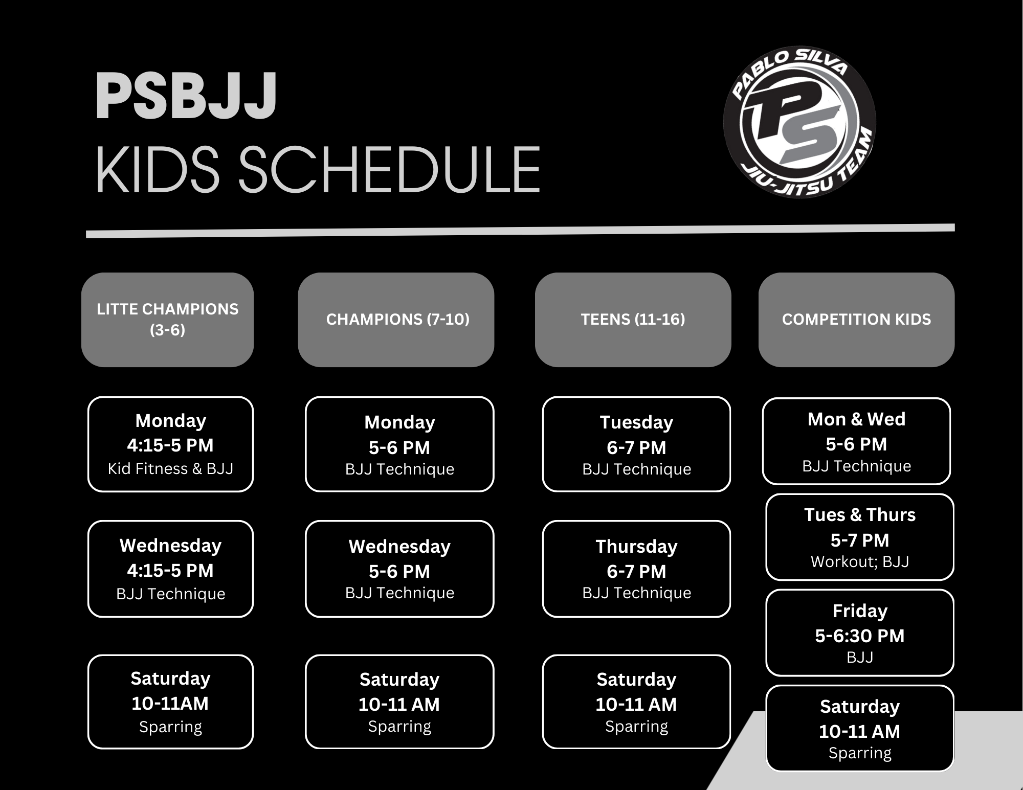 At Pablo Silva Brazilian Jiu Jitsu, we make it our priority to help you accomplish all of your fitness goals. In our new, world-class facility fit with a strength and conditioning room, you will have everything you need to succeed. With personalized instruction from 2010 IBJJF Black Belt World Champion Pablo Silva, our classes will challenge you, help build confidence, develop your mental fortitude, and help you get in the best shape of your life. Men, women, and children as young as 3 yrs. old are sure to benefit from any of our programs at Pablo Silva BJJ.
